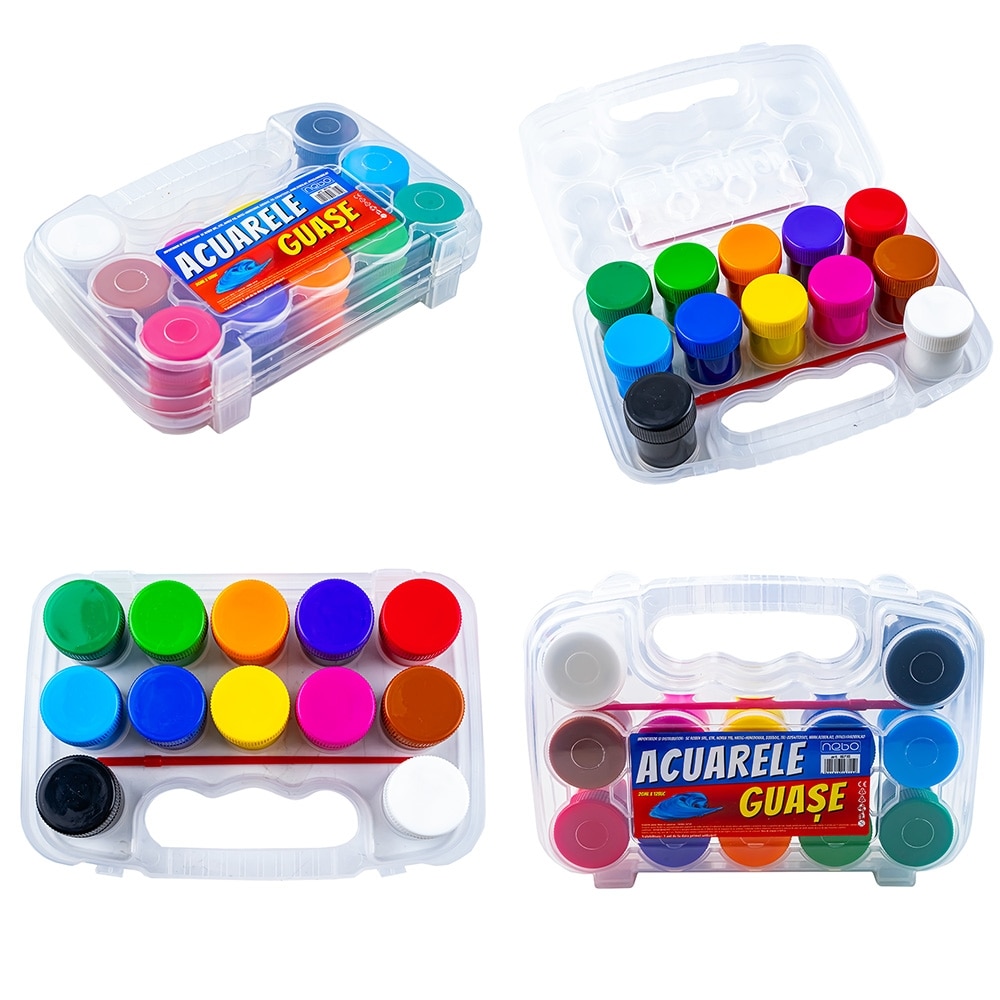 – Fiecare culoare este ambalata intr-un recipient de 20 ml, iar intregul intr-o gentuta din plastic translucid. Datorita recipientelor din plastic transparent, prevazute cu capac in culoarea vopselei culorile sunt usor de sortat si depozitat. Daca se usuca, doar adaugati putina apa si vopselele isi vor recapata consistenta initiala. Gentuta are godeuri potrivite dimensiunii recipientelor, ceea ce faciliteaza depozitarea vopselelor si stabilitatea lor in timpul transportului. Pentru o buna inchidere acesta este echipata cu doua clame de inchidere.