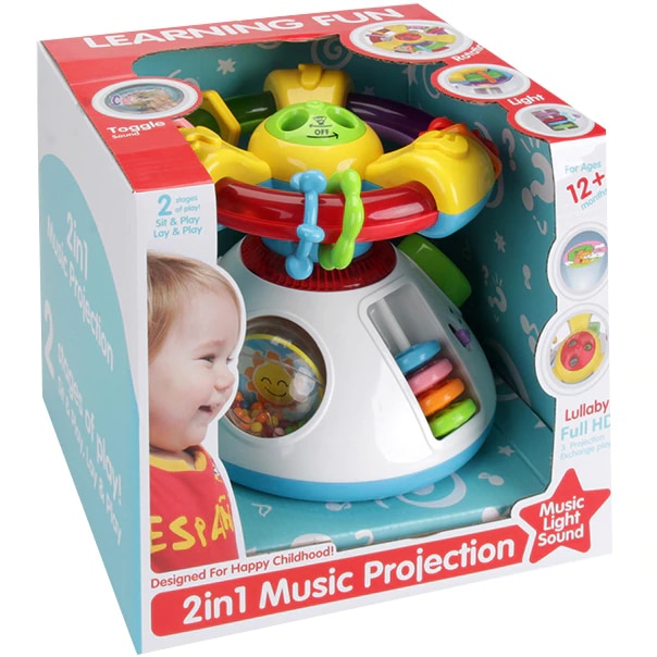 Acesta jucarie multifunctionala poate fi de un real ajutor parintilor atat in a mentine copilul ocupat pe timpul zilei, cat si in procesul de linistire si pregatire a copilului pentru somn, cu ajutorul luminilor, cantecelelor de leagan si imaginilor cu desene animate care pot fi proiectate pe tavan. Proiectorul muzical poate reda inclusiv sunete albe, din natura si poate fi folosit pe post de player, creand o atmosfera magica pentru culcare. De asemenea, poate fi folosit si ca lampa de veghe.