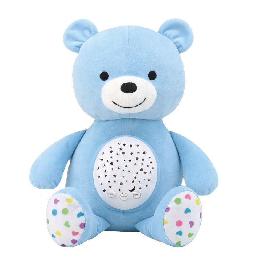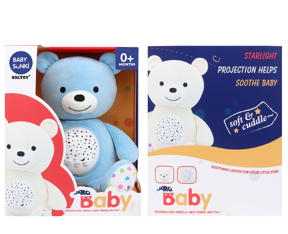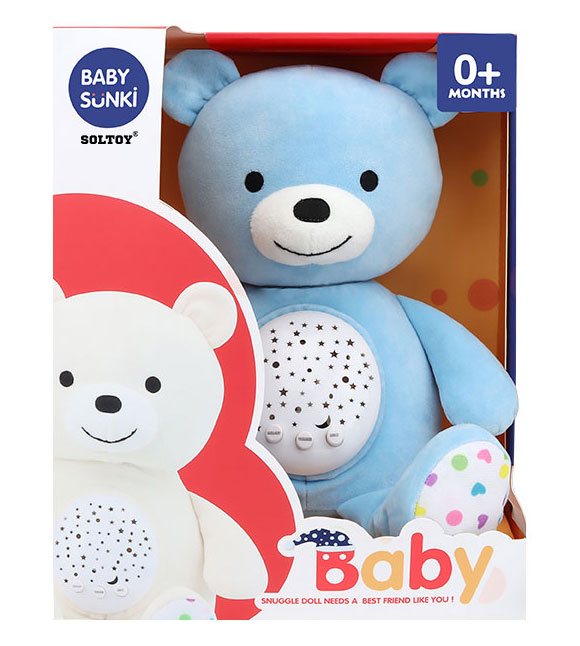 Jucarie de plus si lampa de veghe 2 in 1 SOLTOY Sunki Ursuletul Albastru cu sunete linistitoare si proiectii de lumini.