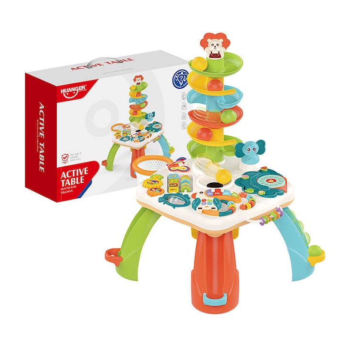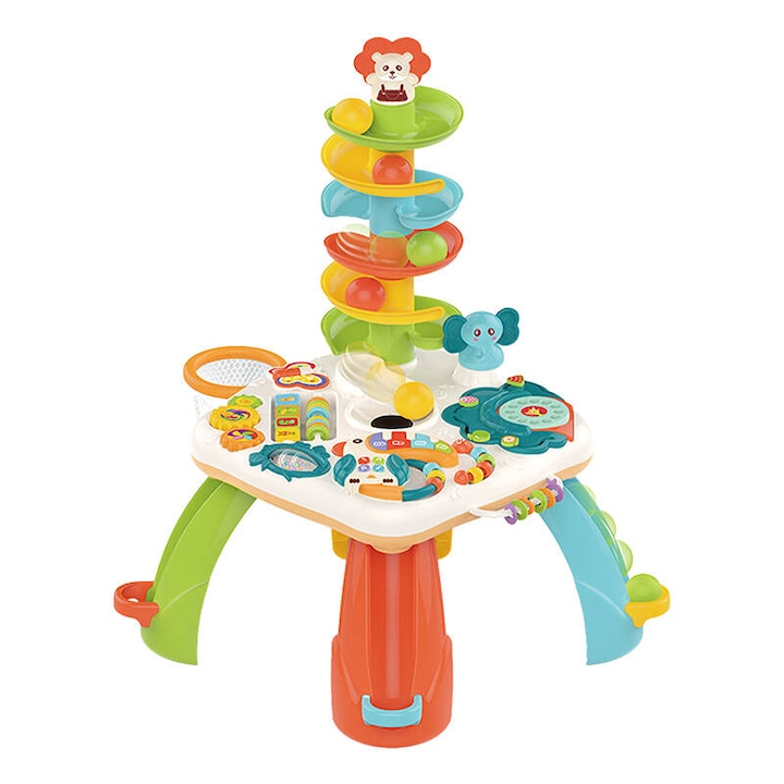 Masa este echipata cu un panou educational interactiv care poate fi indepartat cu usurinta, permitand copilului sa se joace cu el si in afara mesei. Piesa centrala a mesei este un tobogan colorat, pe care copilul mic poate privi bilele rostogolindu-se in jos si in recipiente speciale. Acest tip de joc dezvolta abilitatile manuale si promoveaza dezvoltarea gandirii logice. Panoul are, de asemenea, trei rotite mobile care pot fi puse in miscare, ceea ce ajuta la dezvoltarea preciziei miscarii si a abilitatilor manuale. Intre timp, pianul in forma de tucan, care ofera diverse melodii si sunete, sprijina in continuare dezvoltarea sensibilitatii muzicale si stimuleaza simtul auzului.