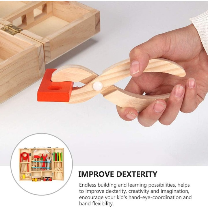 Trusa de scule din lemn pentru copii este un set educativ care transforma jocul intr-o experienta de invatare plina de culoare si imaginatie. Conceputa special pentru micii mesteri curiosi, aceasta trusa din lemn masiv cu margini rotunjite contine o colectie completa de unelte in miniatura, perfect adaptate pentru mainile copiilor. Fiecare piesa este atent finisata si colorata intr-un mod atractiv, ceea ce nu doar stimuleaza vizual, dar si incurajeaza dezvoltarea dexteritatii, coordonarii mana-ochi si creativitatii.