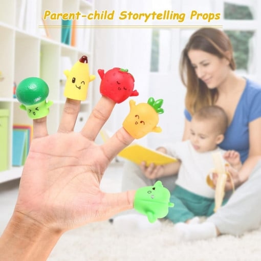 • Continut: Setul include 5 papusi de deget in forma de fructe si legume (morcov, broccoli, banana, varza, capsuna), fiecare avand o fata zambitoare desenata, care adauga caracter si distractie.