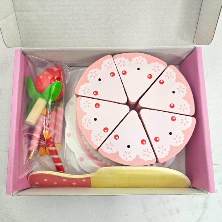 Set complet din lemn: include tortul și diverse accesorii pentru decorare și servire.
