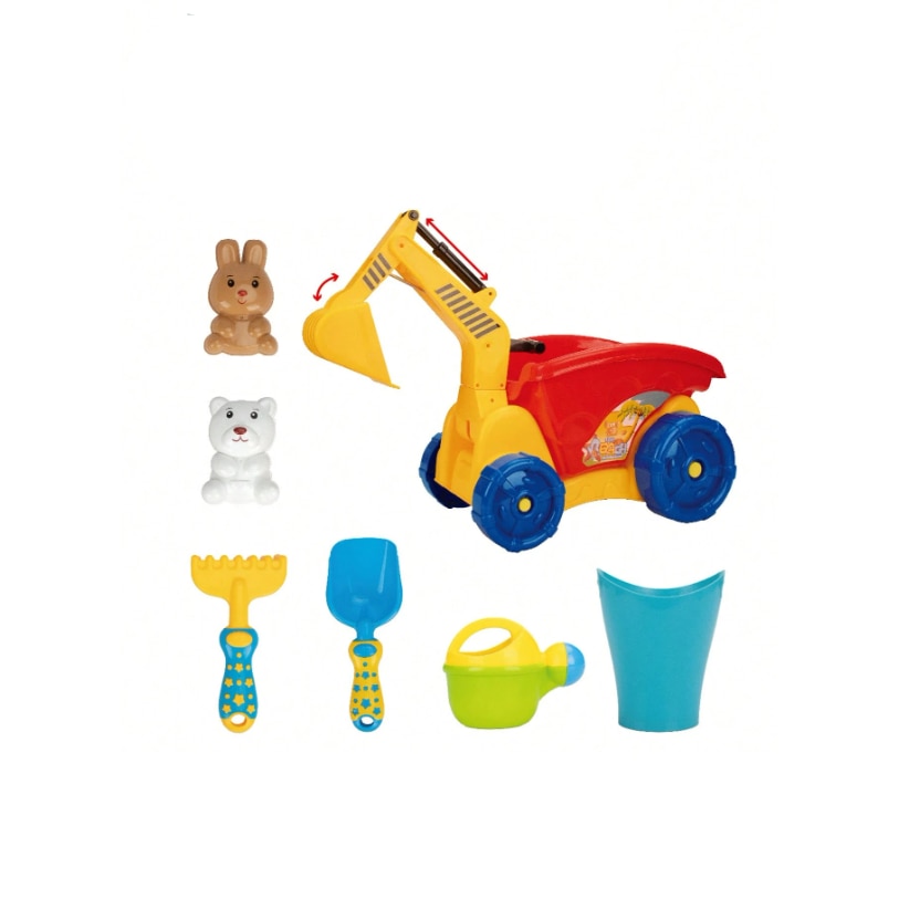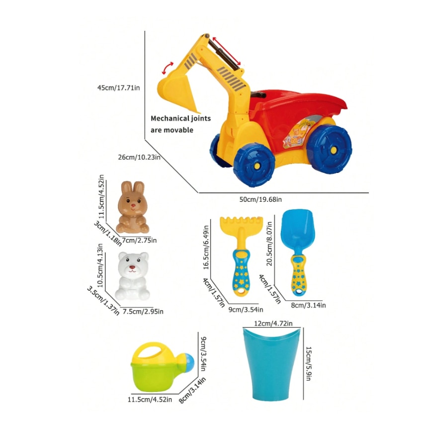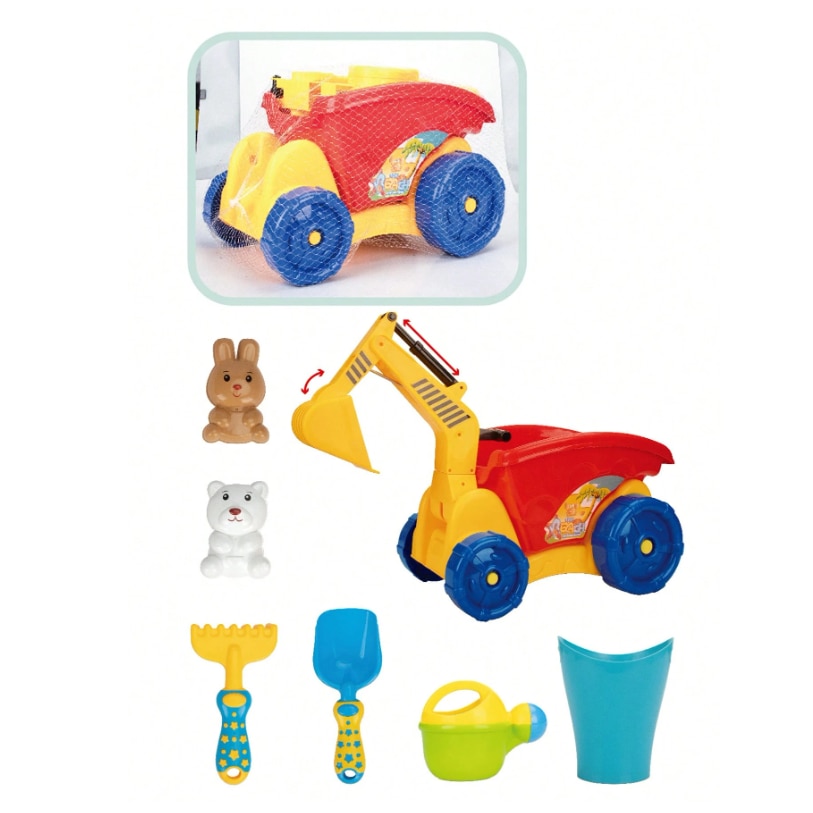 Excavatorul are un design robust, cu roti mari care permis o manevrare usoara pe nisip sau pe alte suprafete. Cupa mobila a excavatorului poate fi ridicata si coborata, oferind un plus de realism si distractie in timpul jocului.