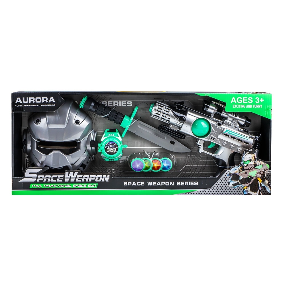 – Setul contine: 1 pistol, 1 masca, 1 cutit, 1 ceas si 4 discuri.