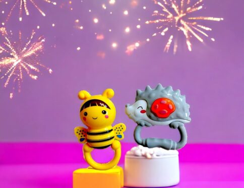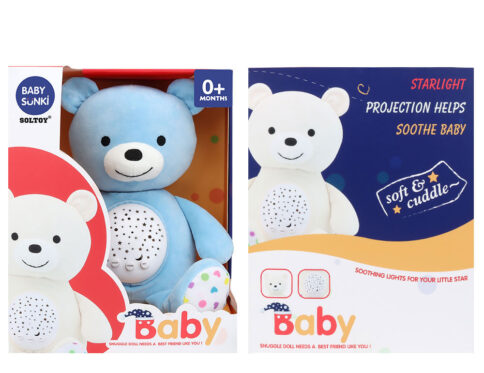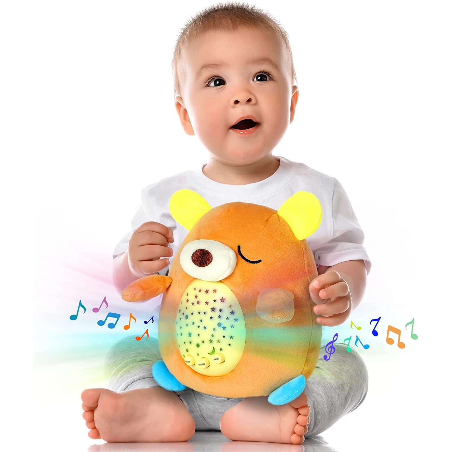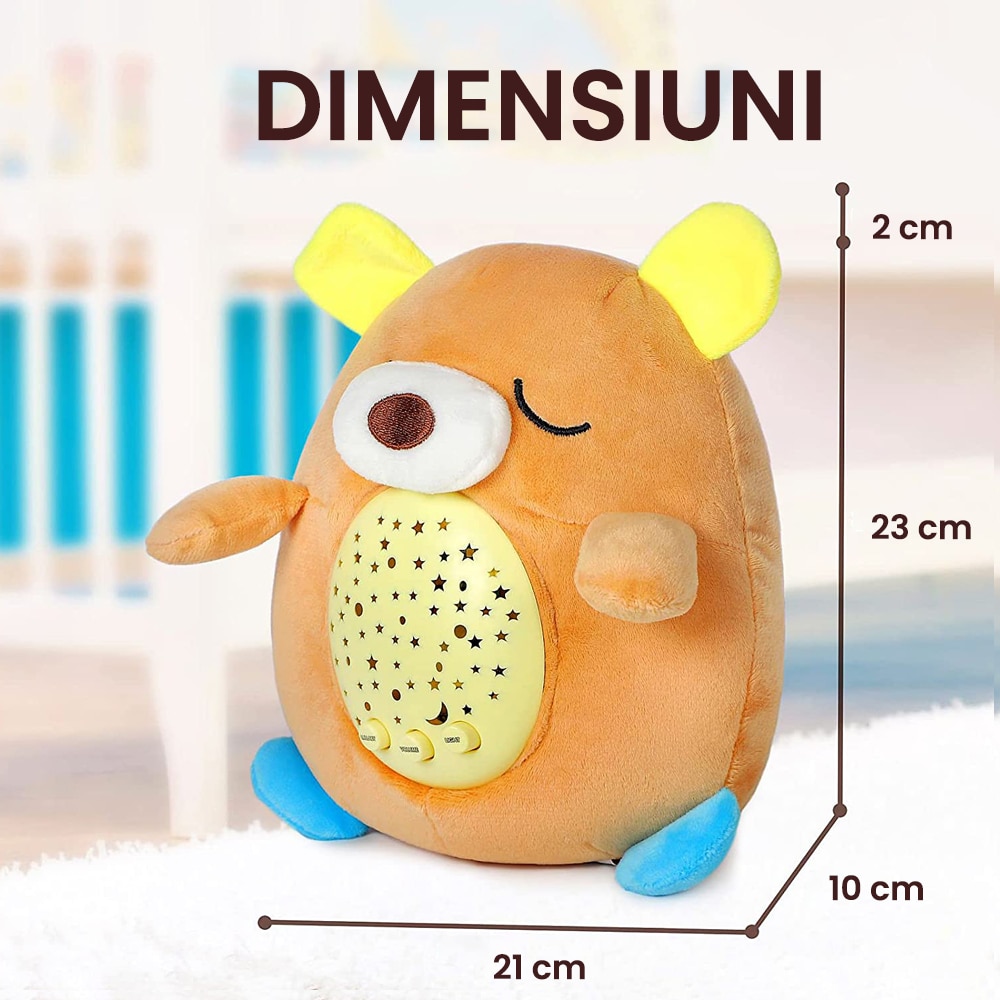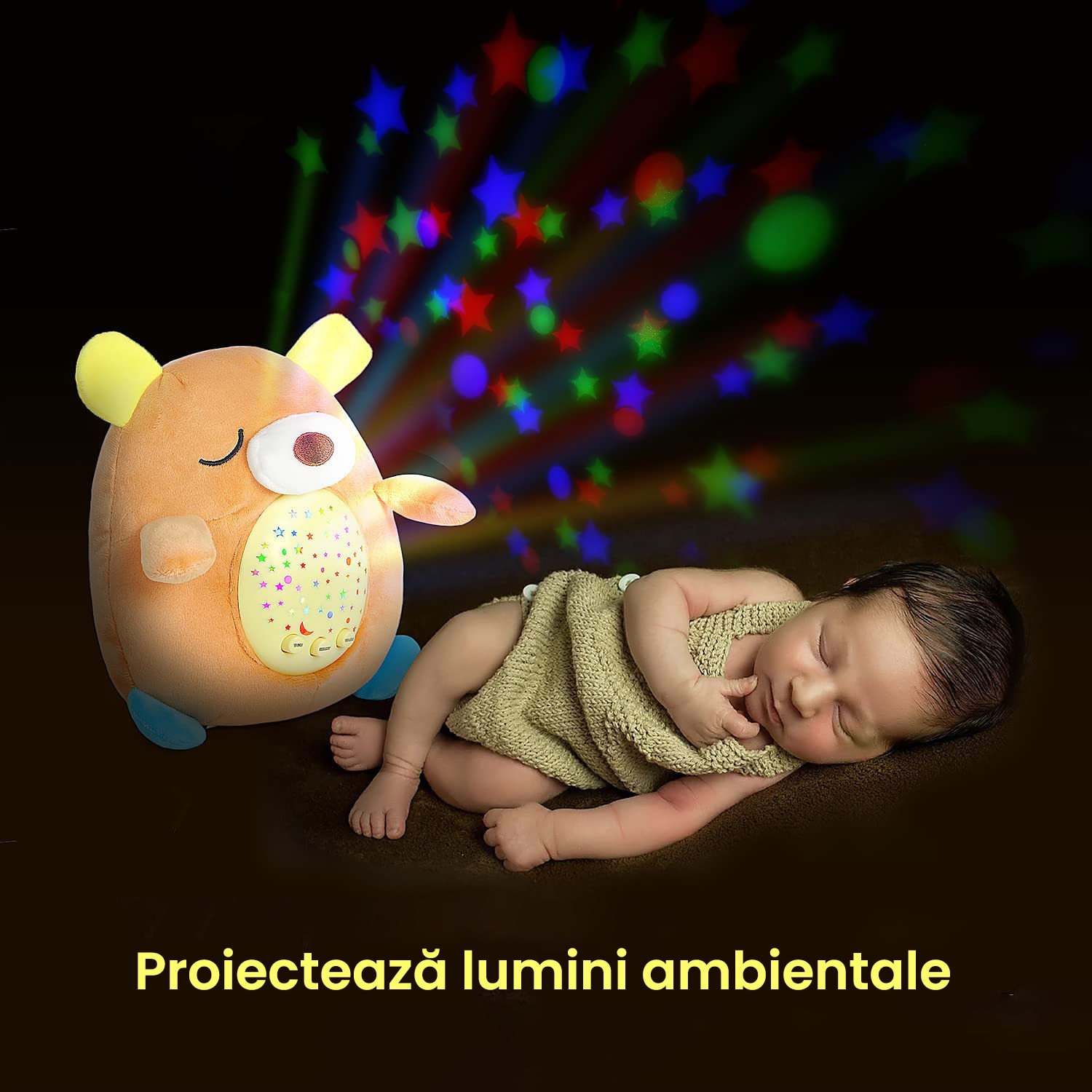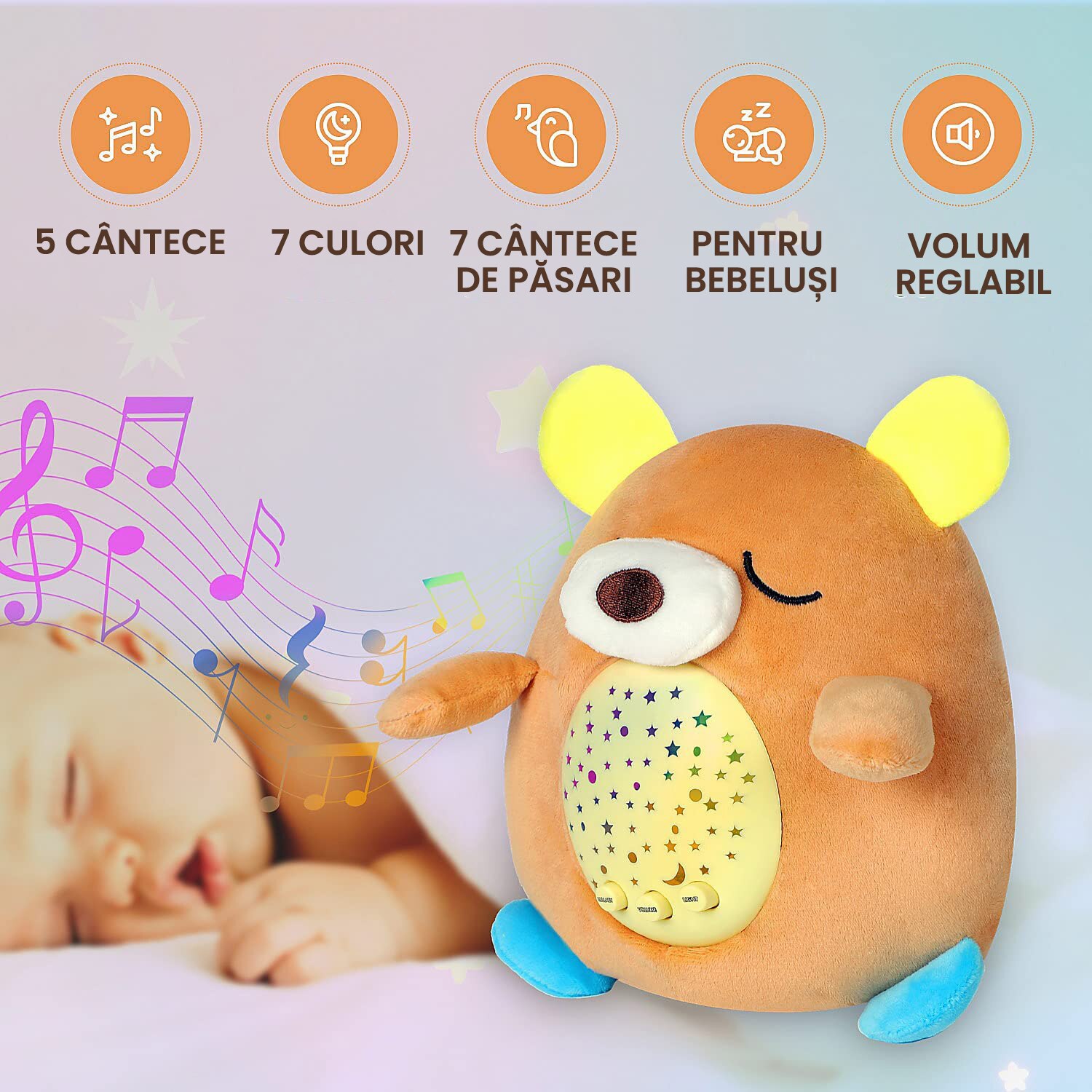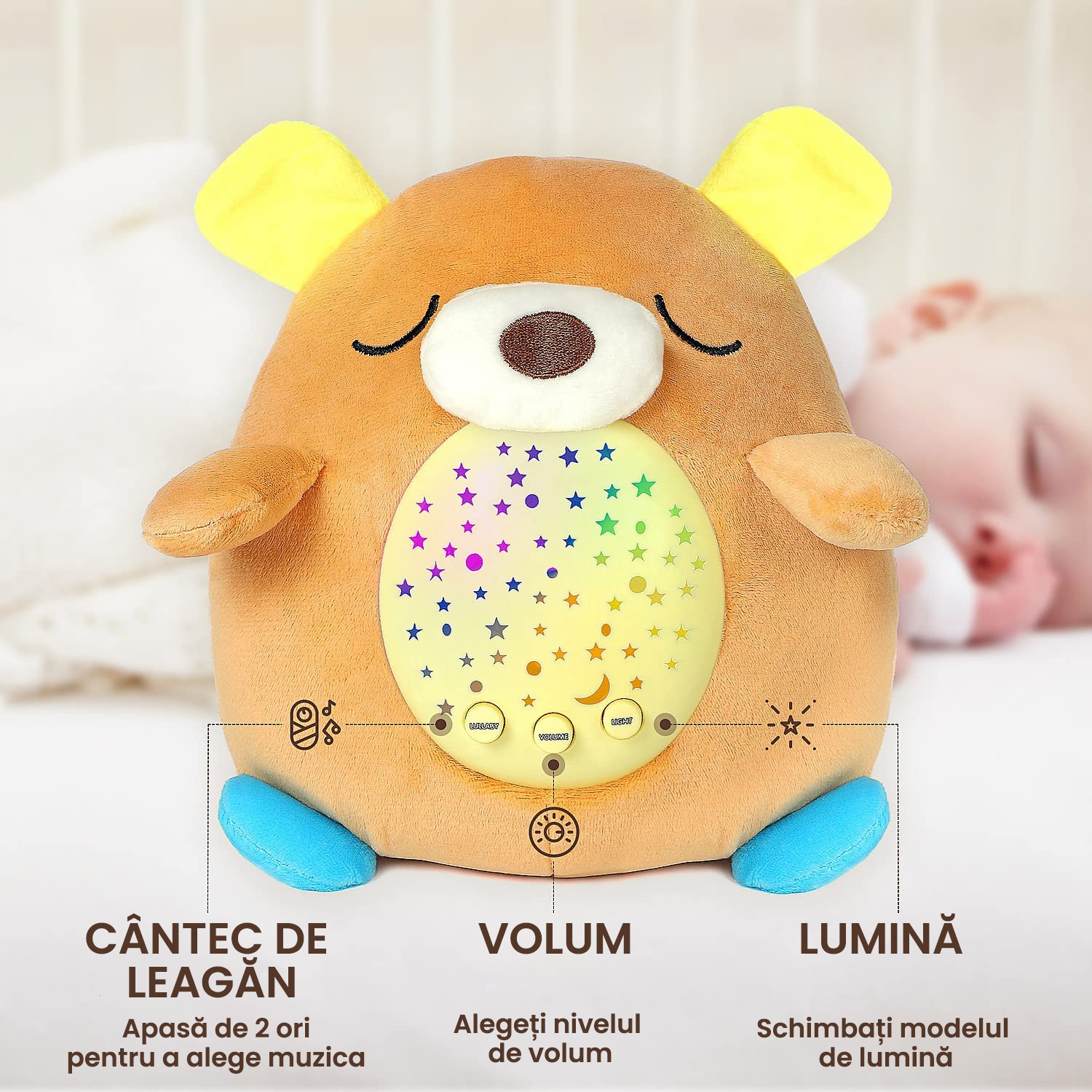 Jucarie de plus PlayFun, cu muzica si lampa de veghe pentru bebelusi, pentru somn cu sunete linistitoare si proiectii de lumini, Maro